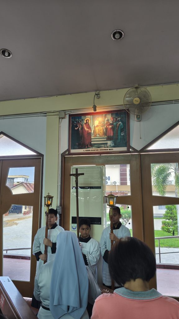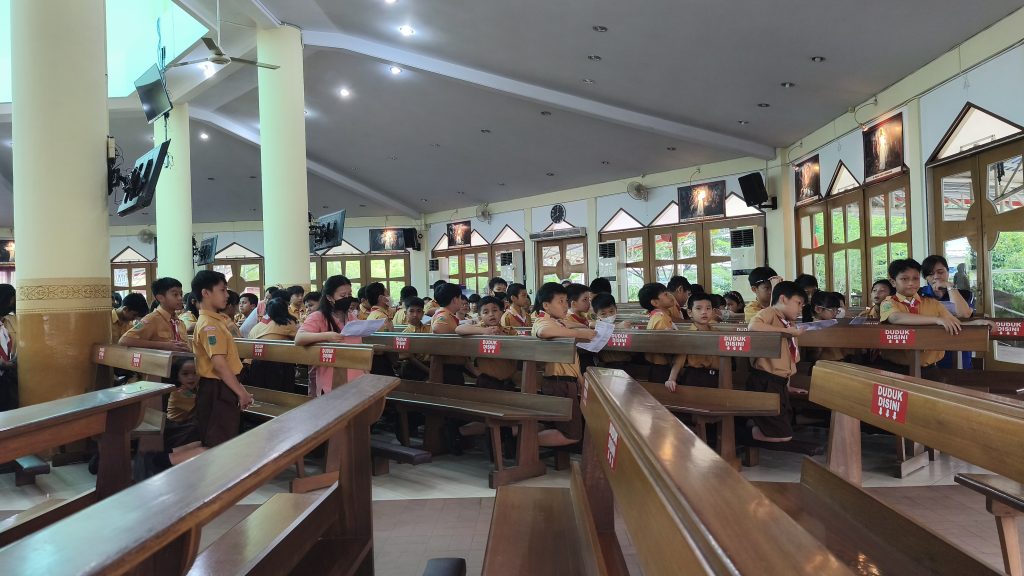 Sesampainya di Gereja St. Sesilia, seluruh siswa masuk dan duduk bersama di dalam gereja untuk memulai Ibadat Jalan Salib. Suasana doa yang tenang akan dibangun agar para siswa dapat merenungkan kisah sengsara Yesus Kristus dengan penuh penghayatan. Kebersamaan di dalam gereja ini diharapkan dapat memperkuat solidaritas iman seluruh warga sekolah.