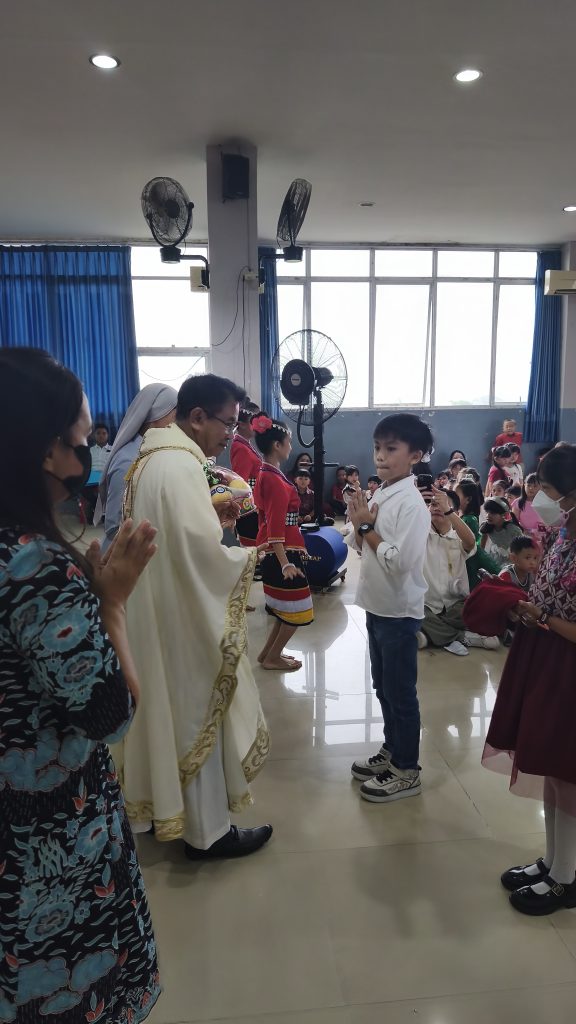 Kegiatan diawali dengan Misa Natal bersama yang berlangsung dengan khidmat. Seluruh siswa, guru, dan staf mengikuti perayaan Ekaristi dengan penuh sukacita dan rasa syukur atas penyertaan Tuhan sepanjang tahun. Suasana aula dipenuhi dengan nuansa Natal yang hangat dan penuh damai.